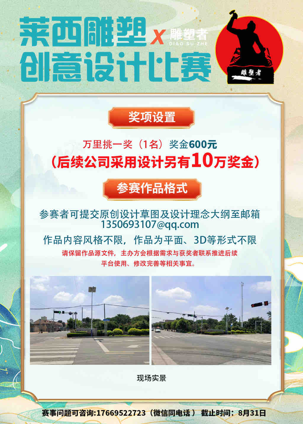 ?莱西雕塑创意设计比赛 【设计说明】 本次比赛以“莱西南墅镇”为主题,进行地域标志性的雕塑原创设计。 ?结合当地特色,设计一个网红打卡地。莱西南墅镇主要是产业是石墨产业,当地还有青山湖和大青山旅游区,景色秀丽。 ?雕塑主题:结合本地石墨产业,突出南墅镇好山好水好地方,风格不限,作品可为平面、3D等,形式不限。希望大家发挥想象,欢迎积极投稿,详情可联系客服?私聊。 ?【奖项设置】 万里挑一奖(1名)奖金600元(后续公司采用设计另有[庆祝]10万奖金) ?【参赛作品格式】 参赛者可提交原创设计草图及设计理念大纲至邮箱1350693107@qq.com 请保留作品源文件,主办方会根据需求与获奖者联系推进后续平台使用、修改完善等相关事宜。 【截止日期】 2023年8月31日